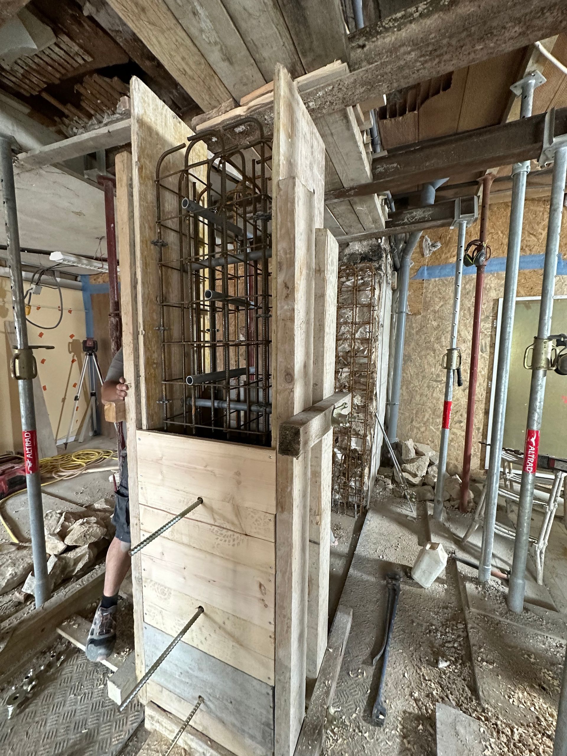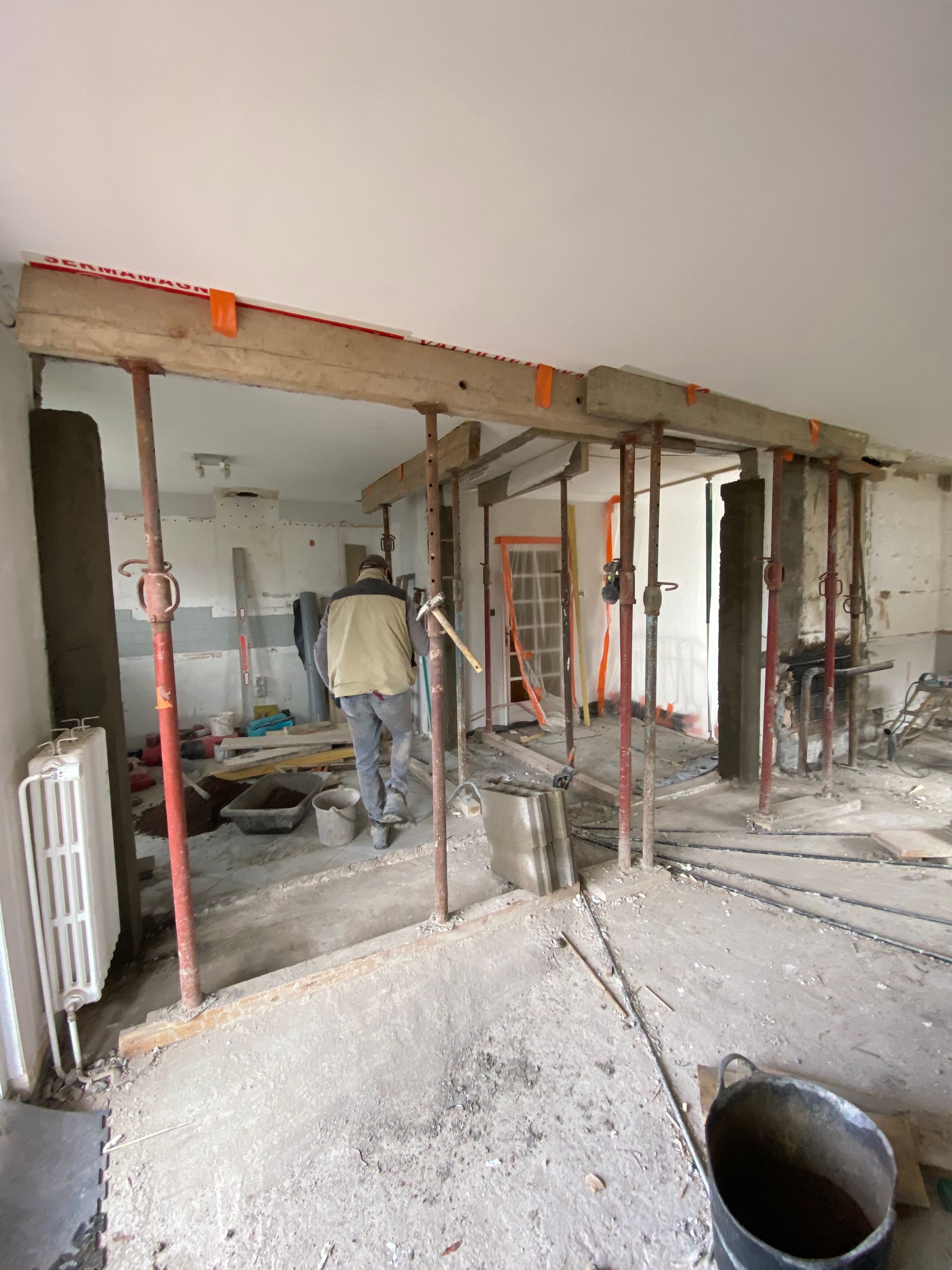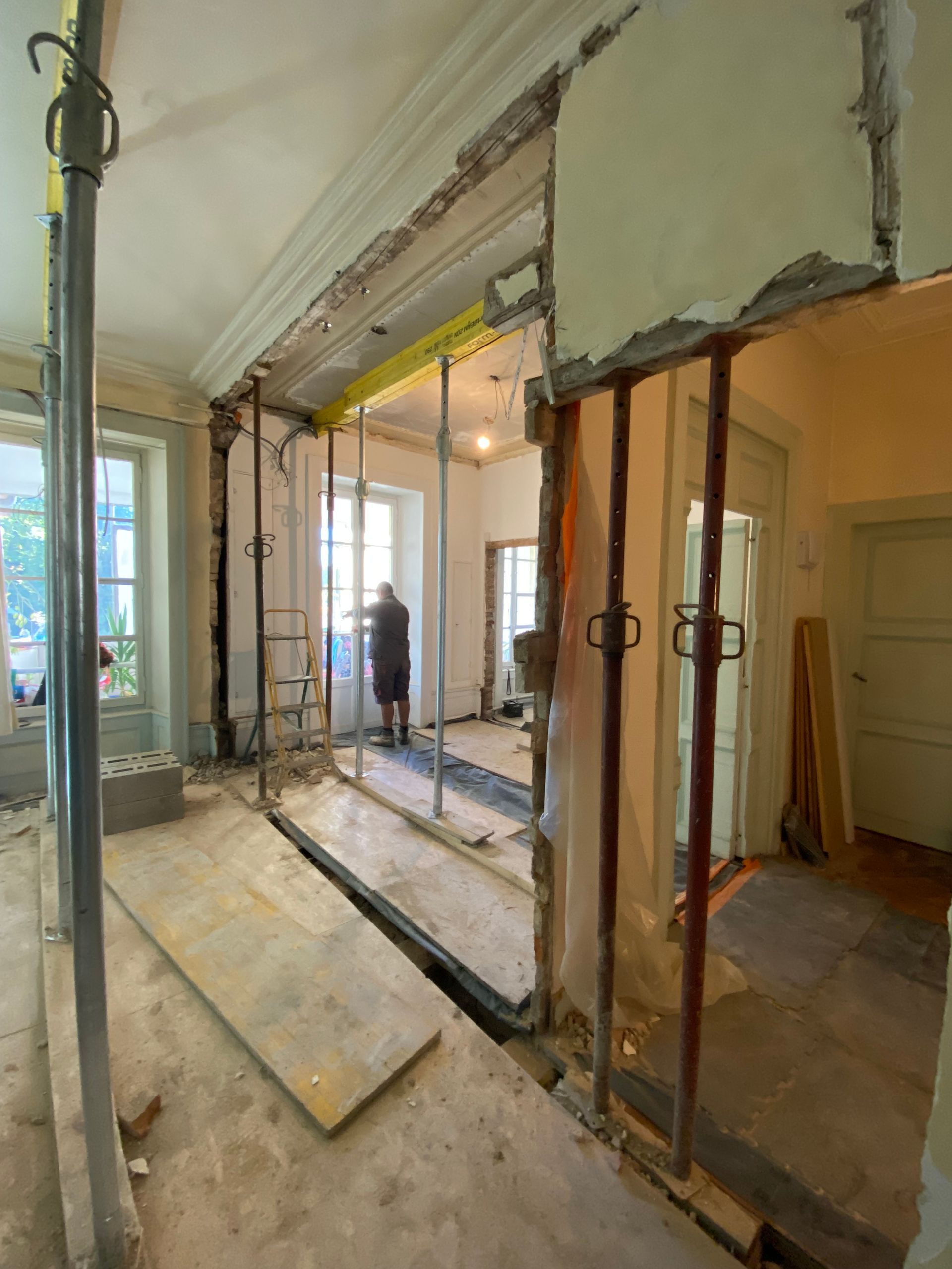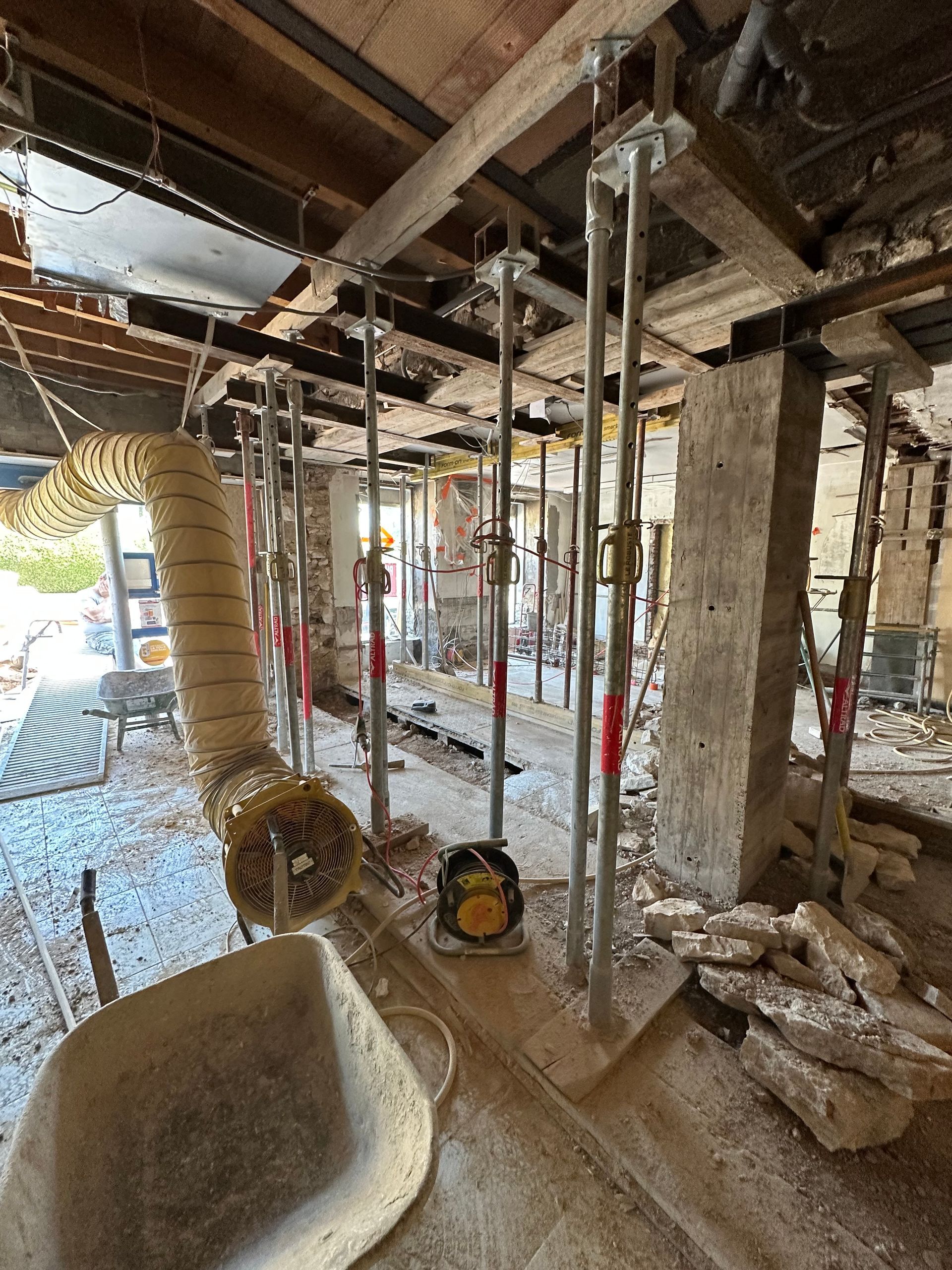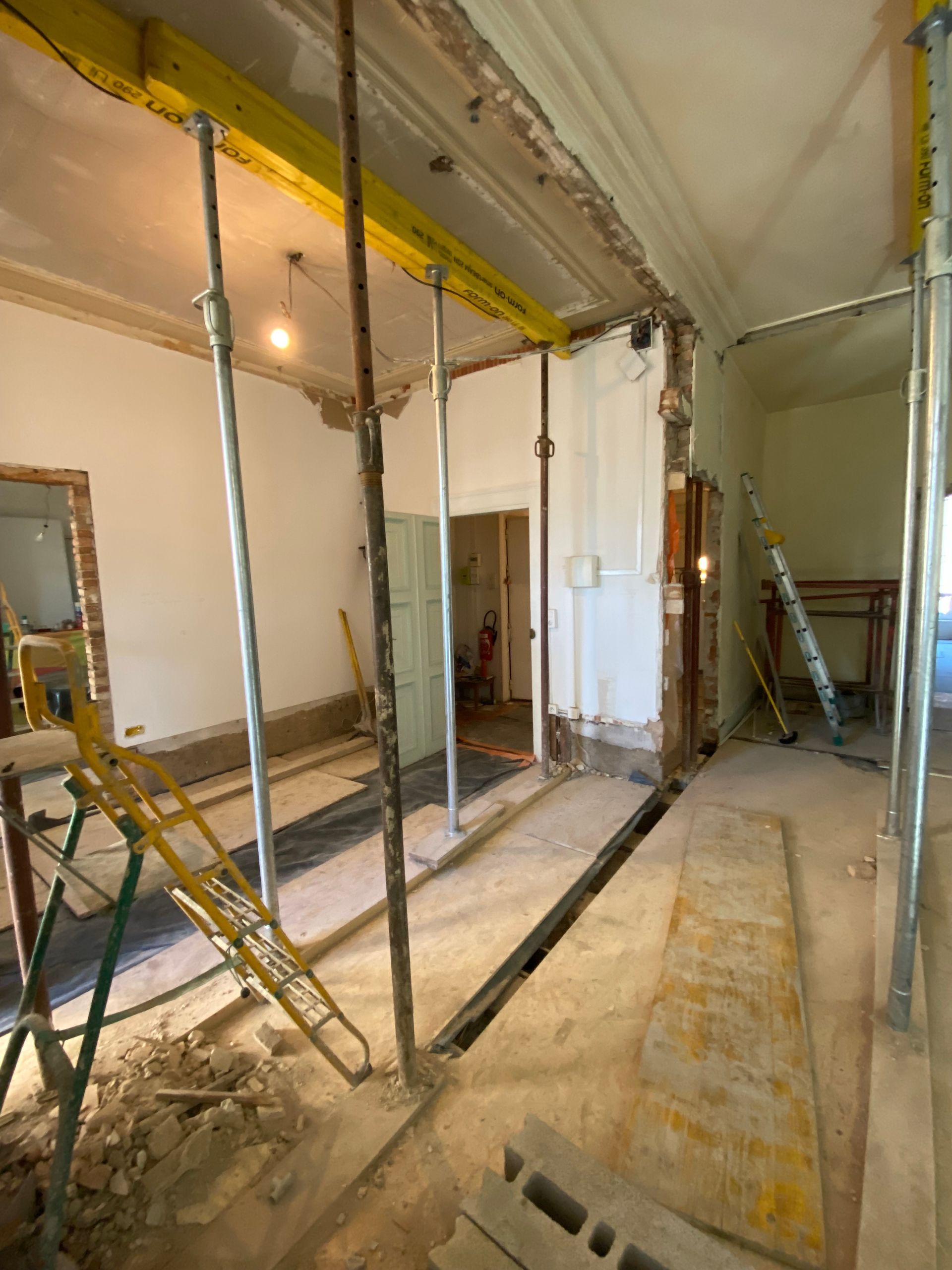 Des étais supplémentaires sont ensuite posés pour renforcer davantage la structure avant toute découpe du mur.