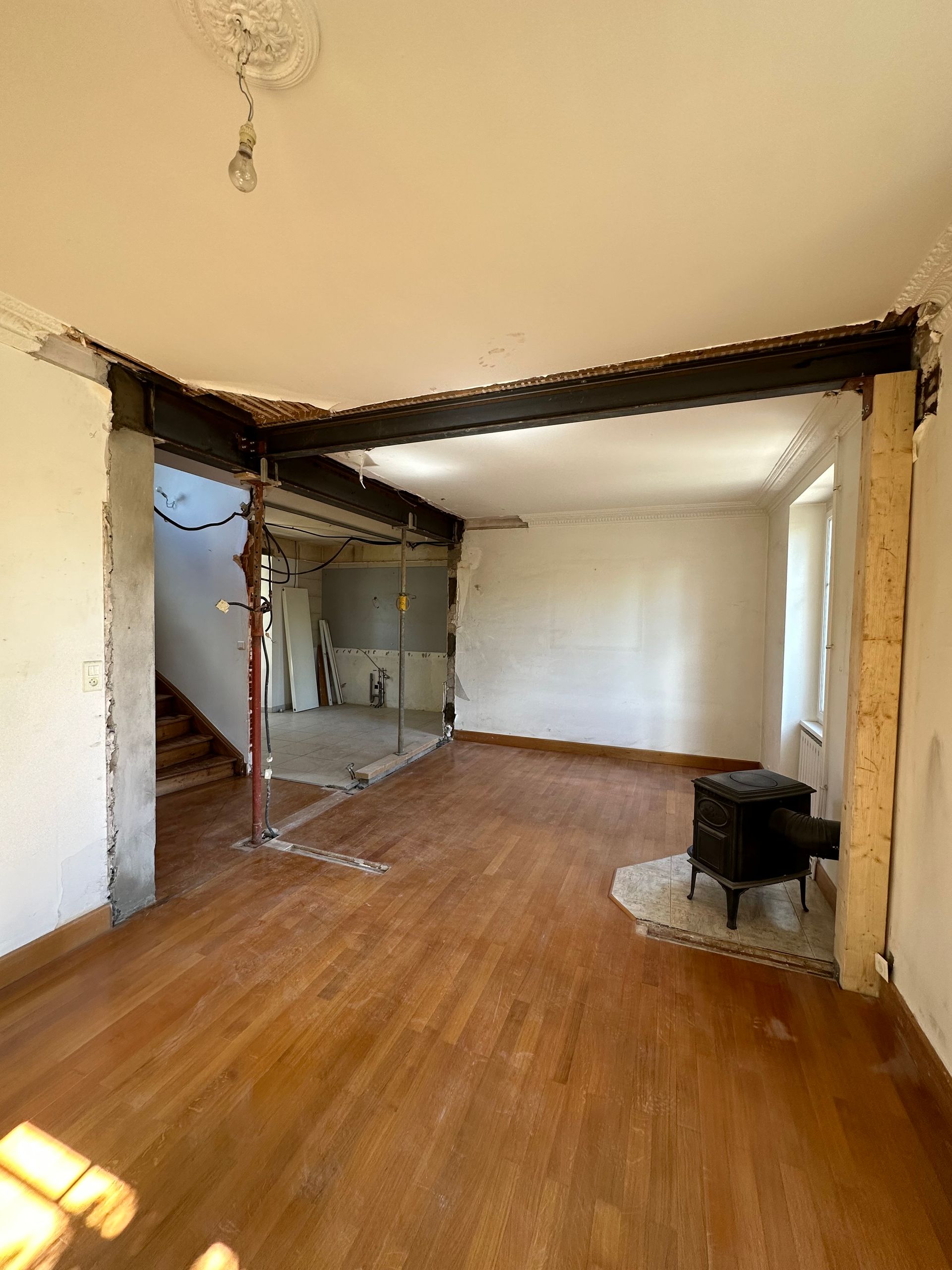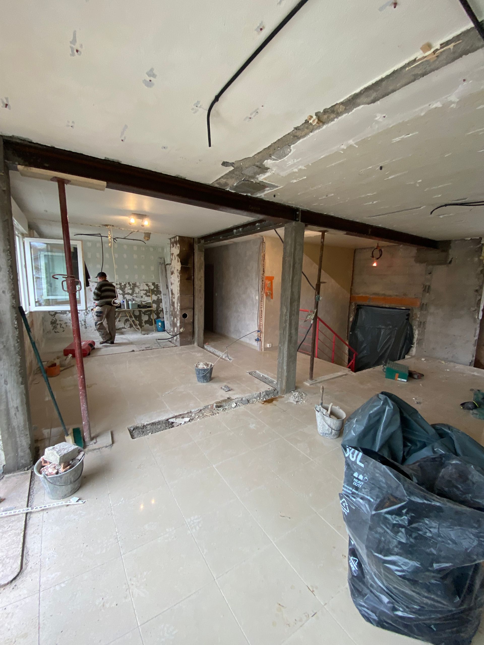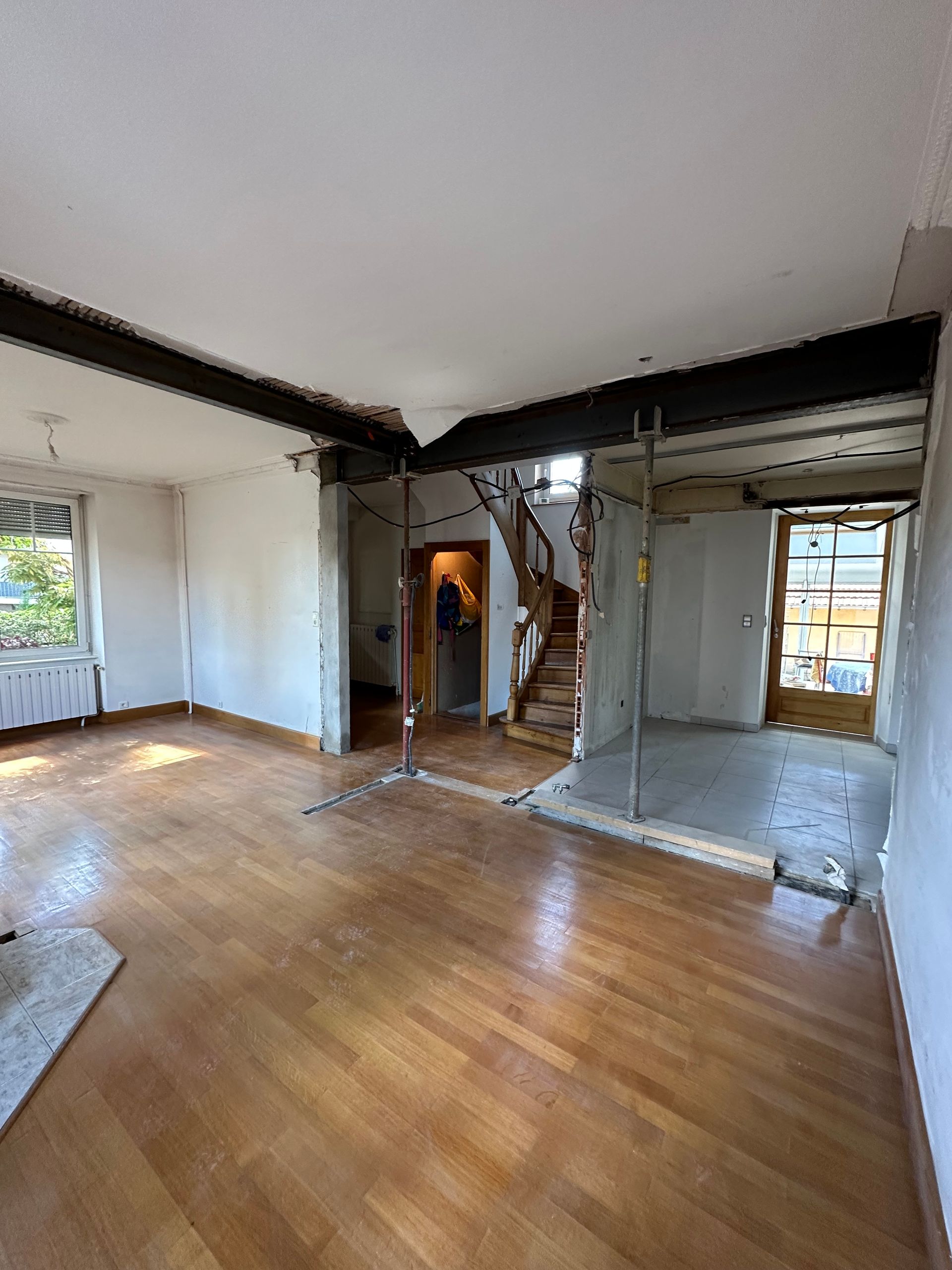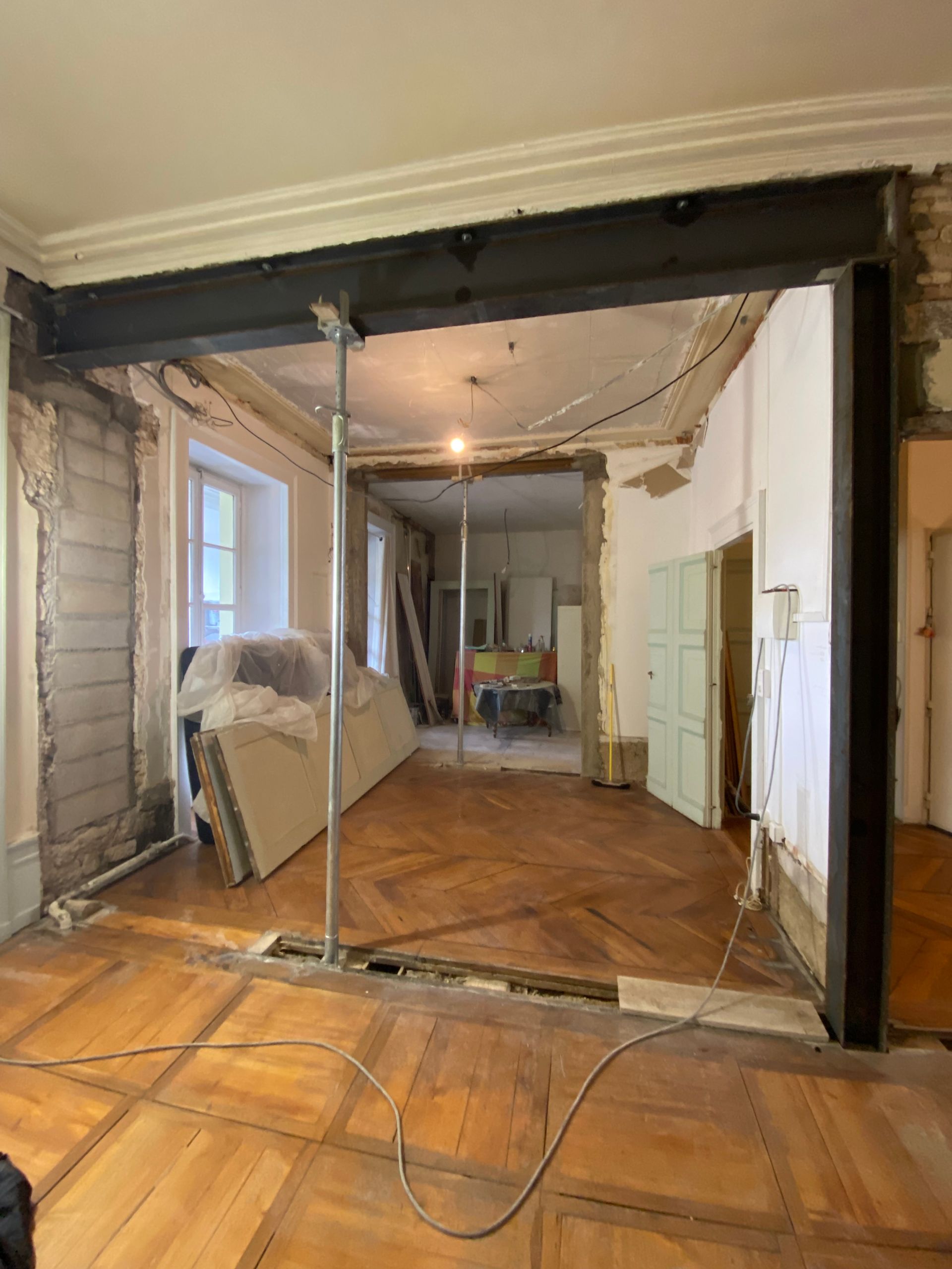 Enfin, le mur porteur est remplacé par une poutre et des jambages en béton armé de chaque côté, assurant ainsi un soutien définitif et sécurisé de la structure.