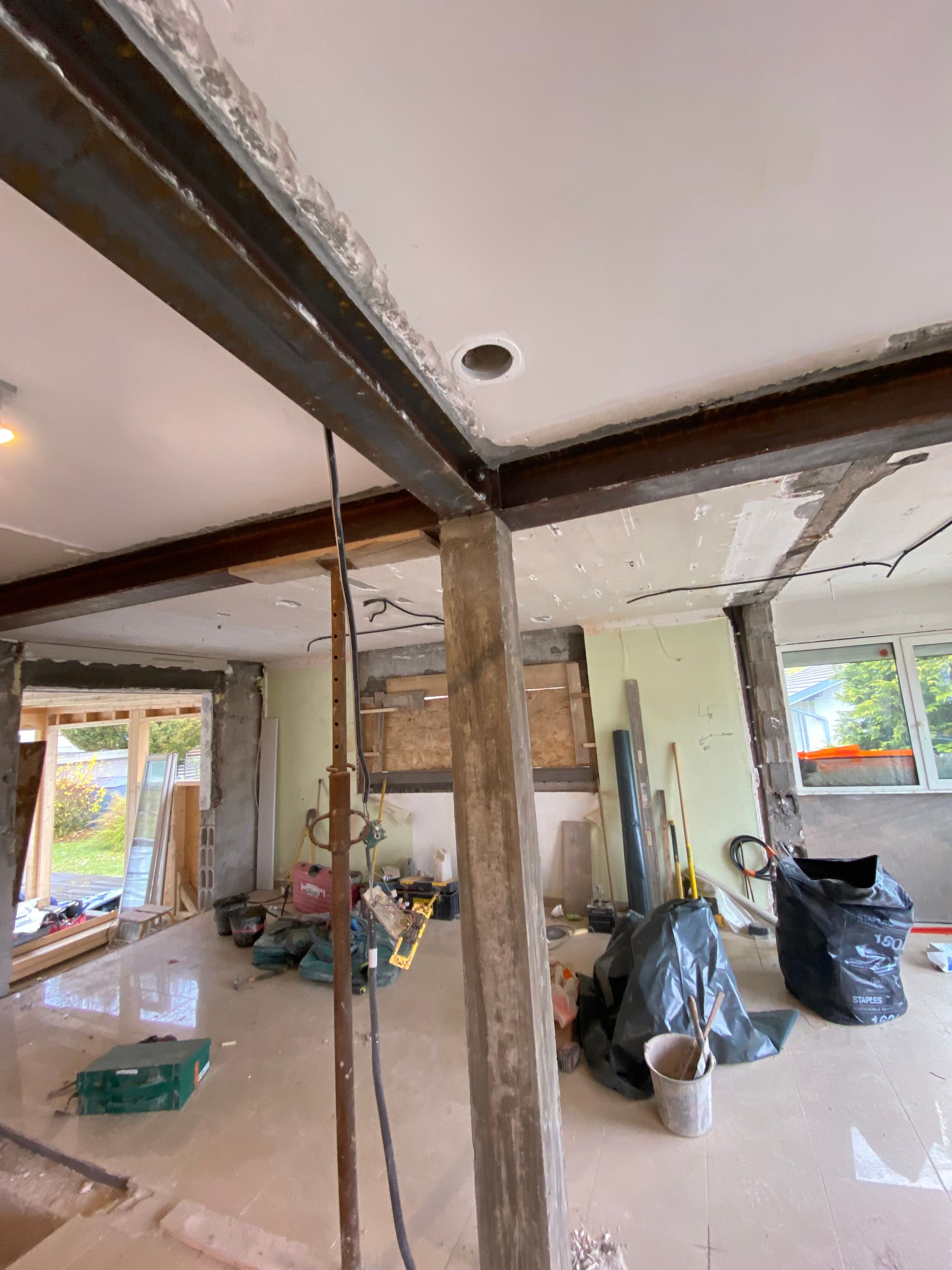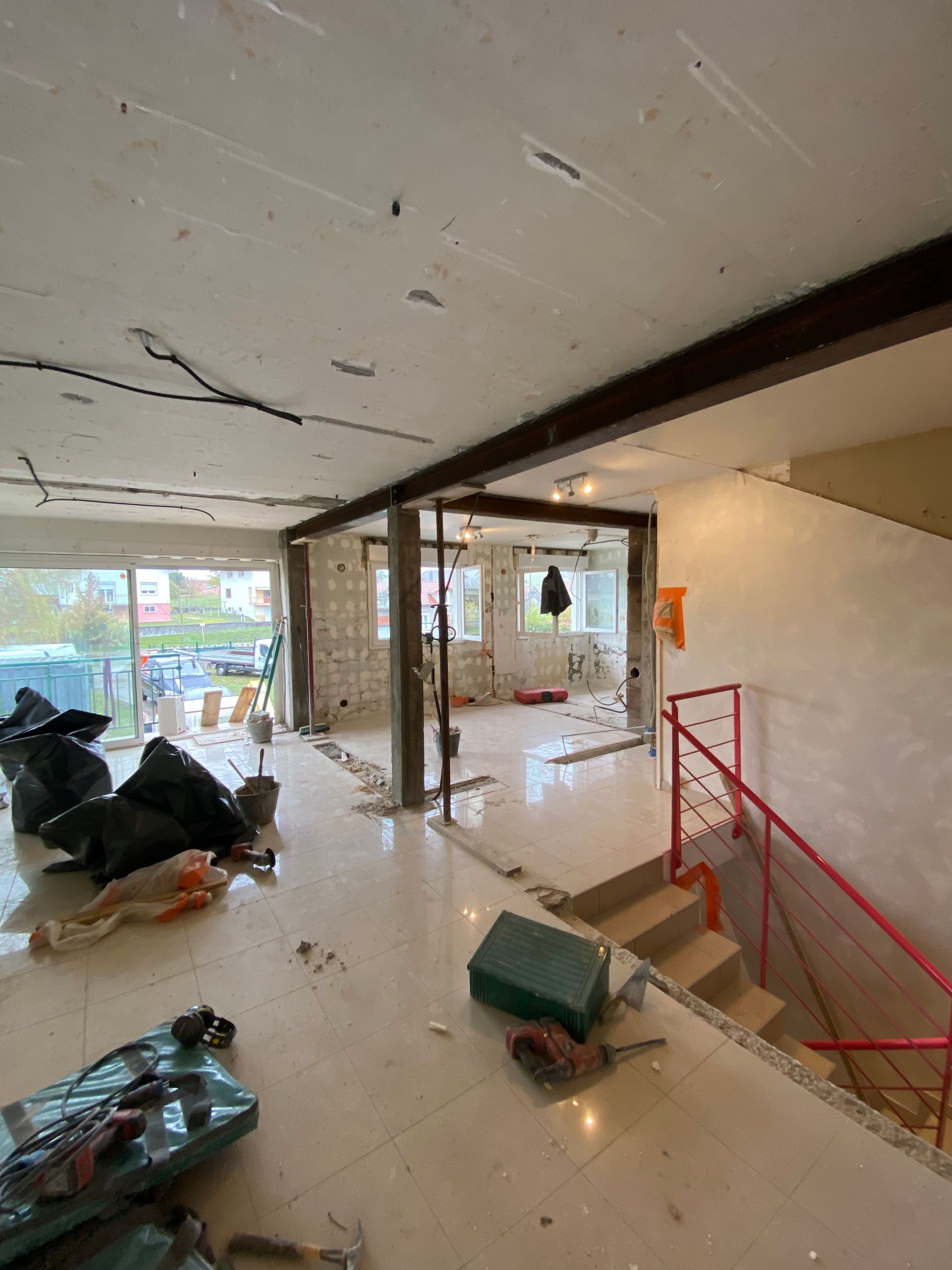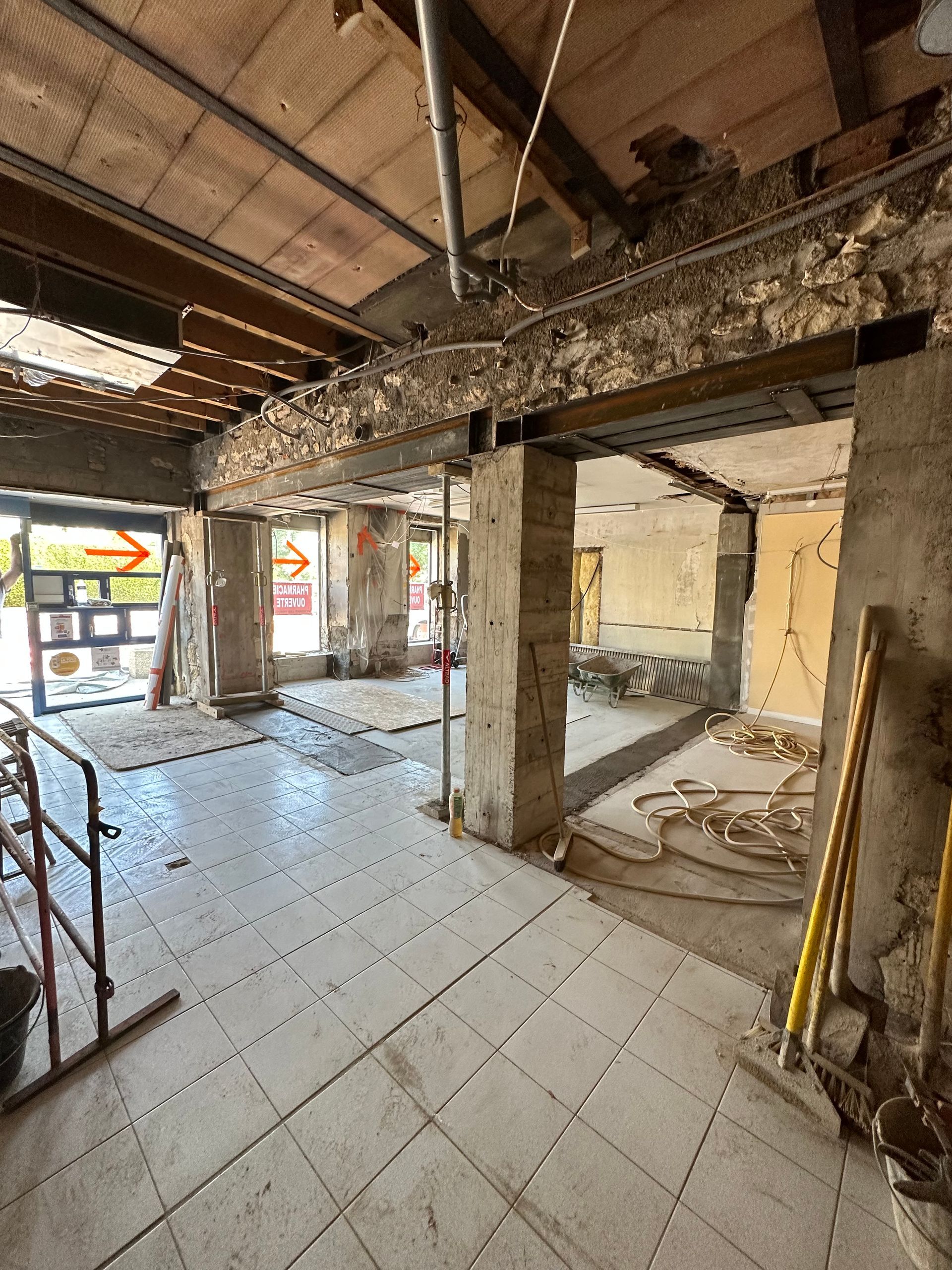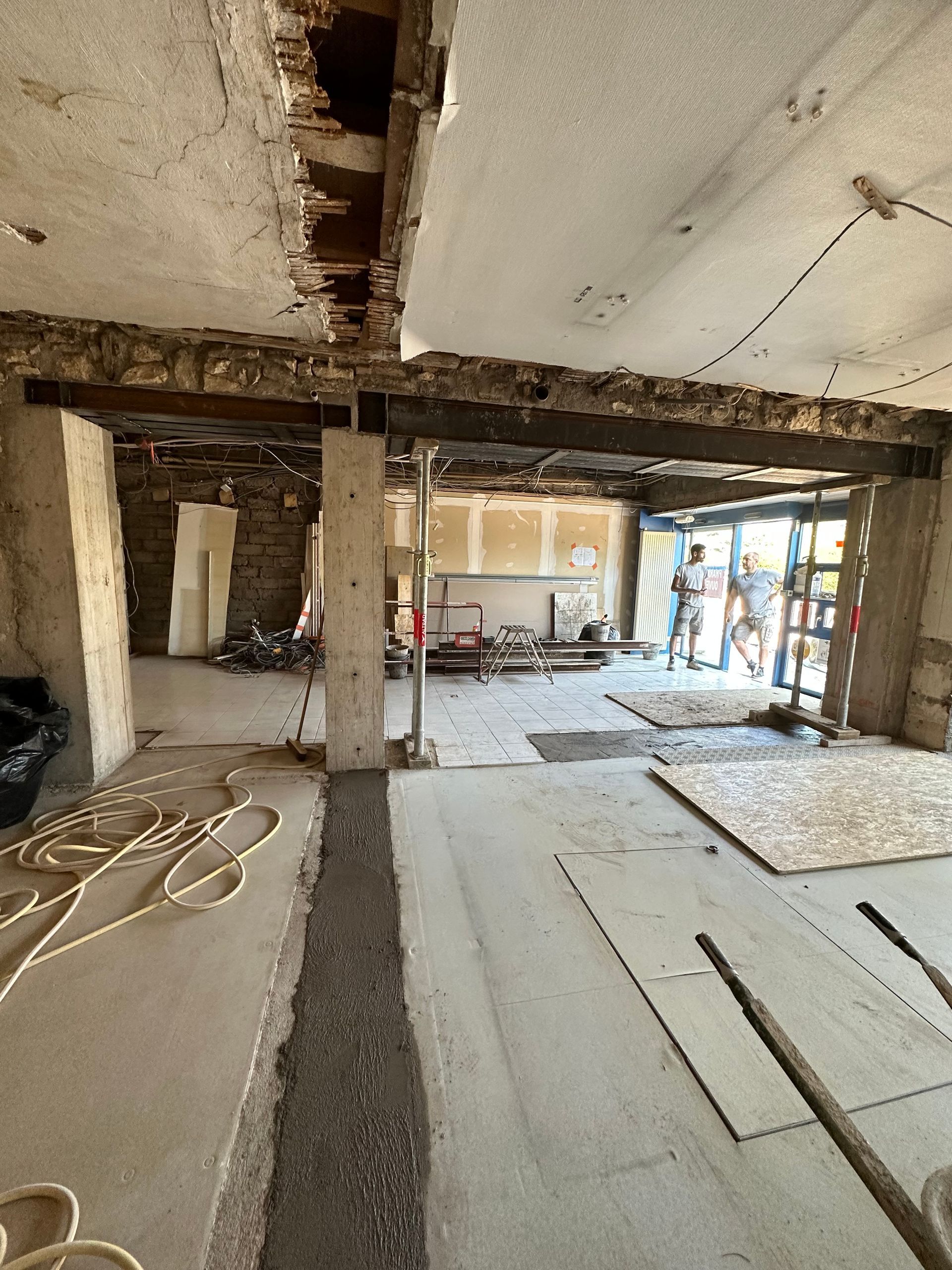 Enfin, le mur porteur est remplacé par une poutre et des jambages en béton armé de chaque côté, assurant ainsi un soutien définitif et sécurisé de la structure.