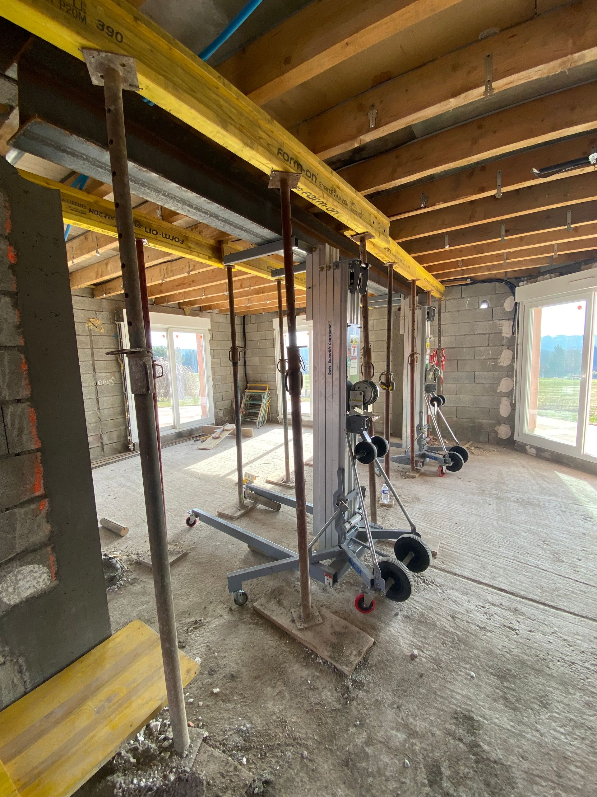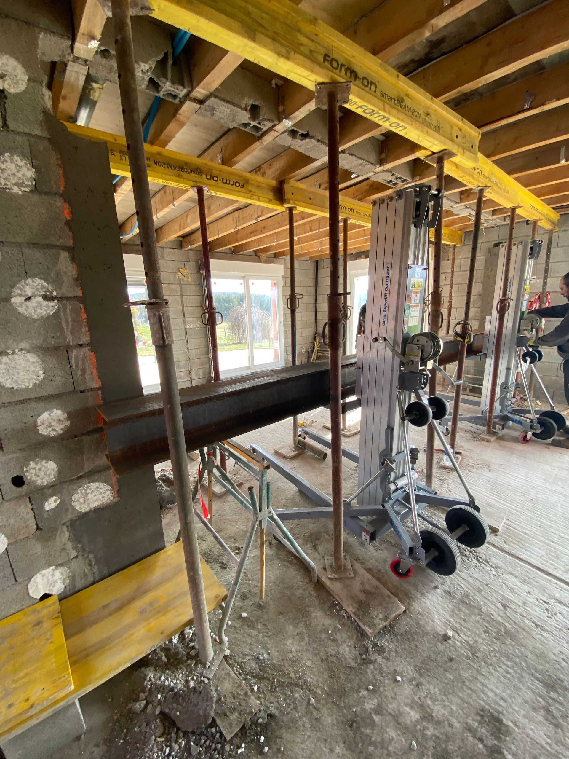 Ensuite nous mettons des profilés, qui sont des poutres provisoires destinées à soutenir la structure avant la pose des poutres définitives ou le coulage d'un linteau en béton armé.